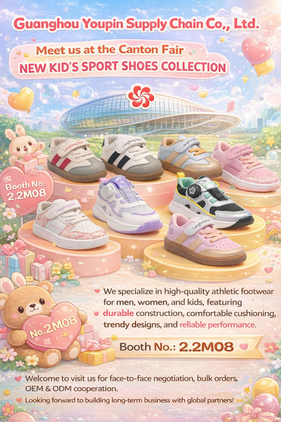 Find us at Booth 2.2M08 in the footwear and children’s products zone. Our dedicated team will be on-site daily (9:30–18:00) to showcase our full range of kids’ sports shoes, share product details, and discuss custom OEM/ODM solutions.